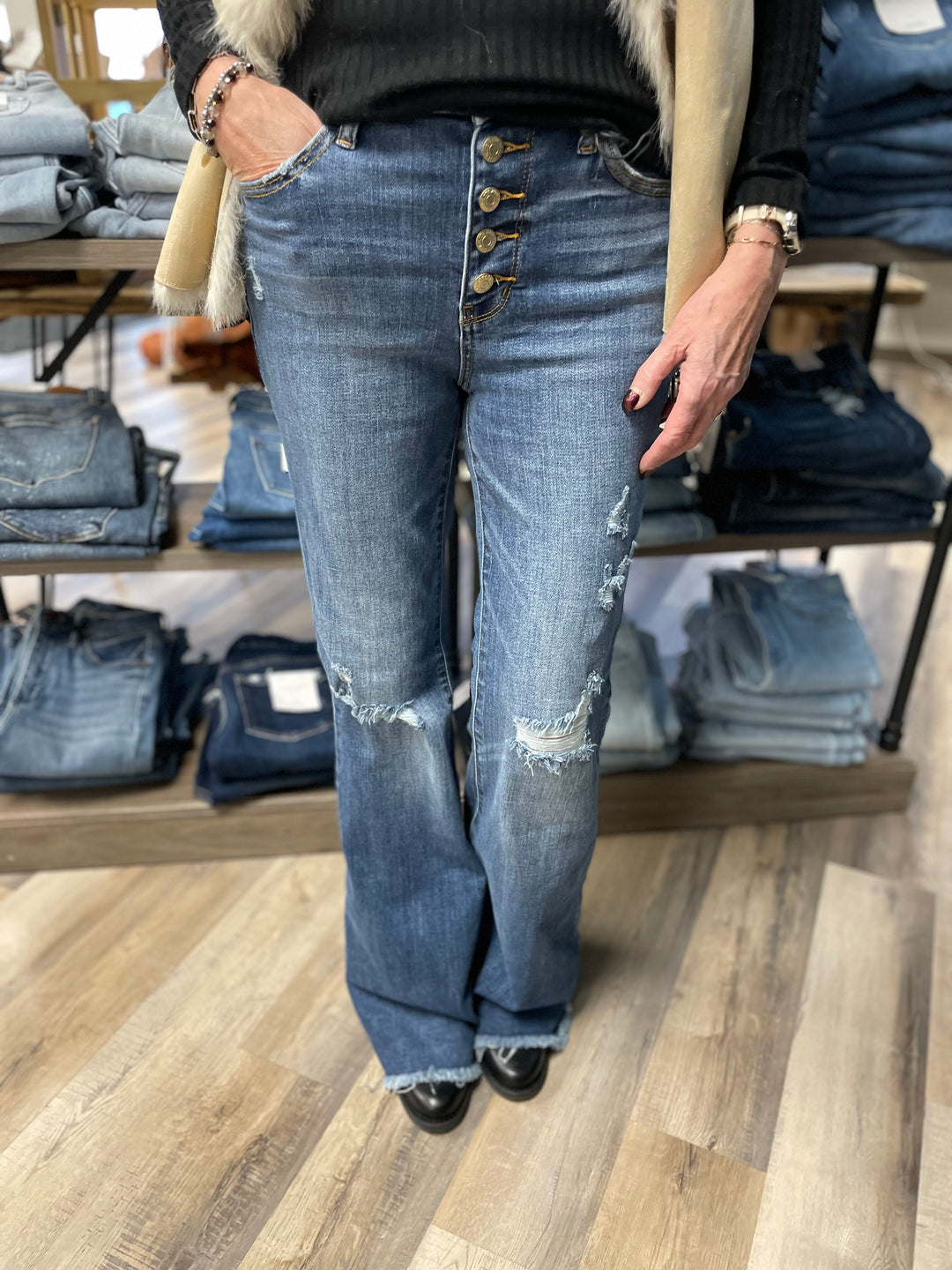 Ladies, you will feel SO confident in these jeans! They are a stunning vintage dark wash in a classic distressed flare style that is just SO flattering on! If you want an extra boost of confidence and to feel so, so good - these are the jeans for you!